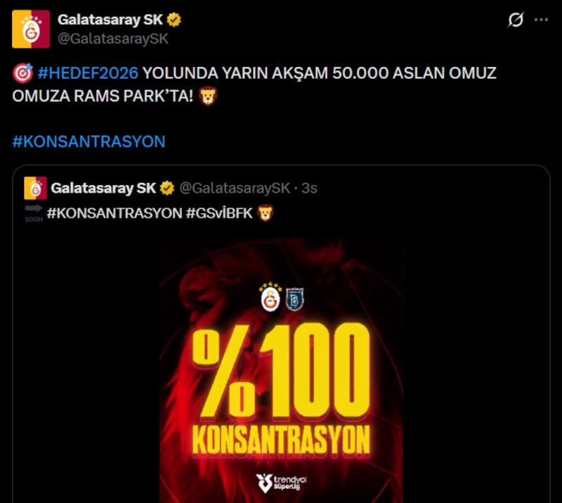 Galatasaray’ın paylaşımında, “HEDEF2026 YOLUNDA YARIN AKŞAM 50.000 ASLAN OMUZ OMUZA RAMS PARK’TA!” ifadeleri kullanıldı.