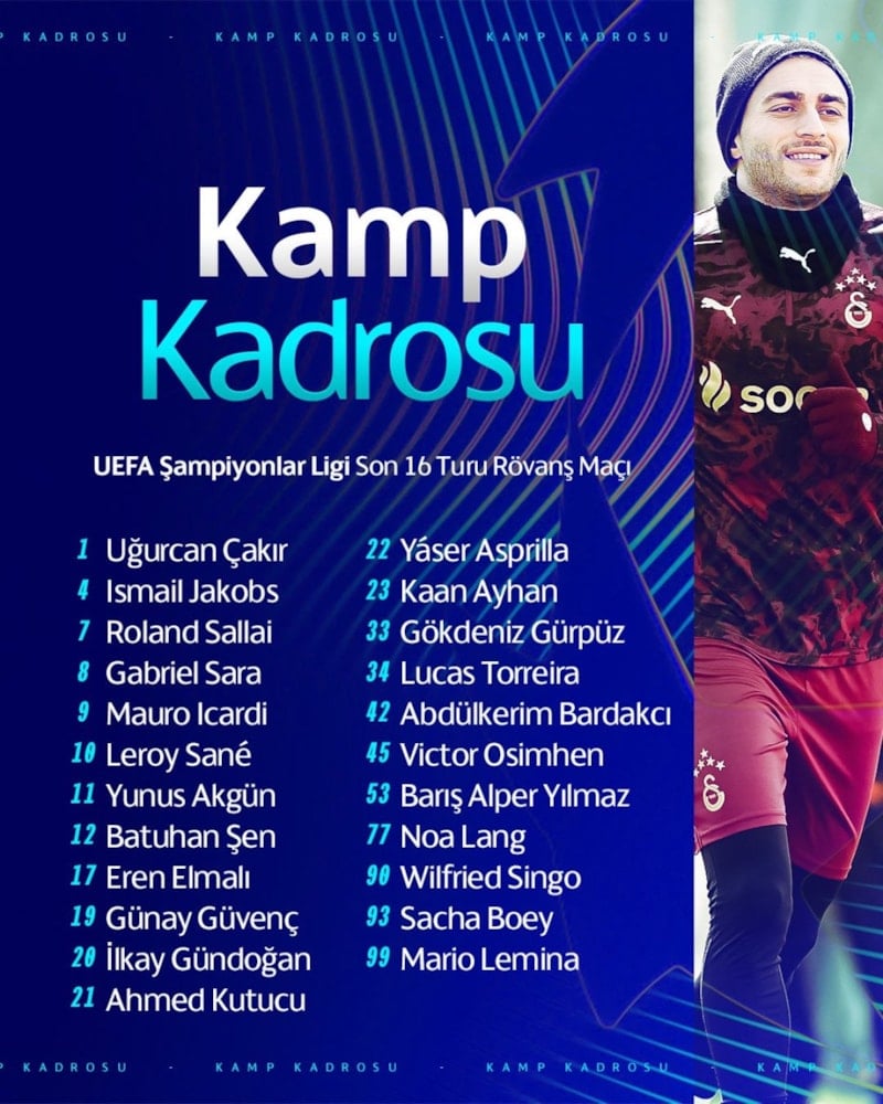 Uğurcan Çakır, Ismail Jakobs, Roland Sallai, Gabriel Sara, Mauro Icardi, Leroy Sane, Yunus Akgün, Batuhan Şen, Eren Elmalı, Günay Güvenç, İlkay Gündoğan, Ahmed Kutucu, Yaser Asprilla, Kaan Ayhan, Gökdeniz Gürpüz, Lucas Torreira, Abdülkerim Bardakcı, Victor Osimhen, Barış Alper Yılmaz, Noa Lang, Wilfried Singo, Sacha Boey, Mario Lemina.
