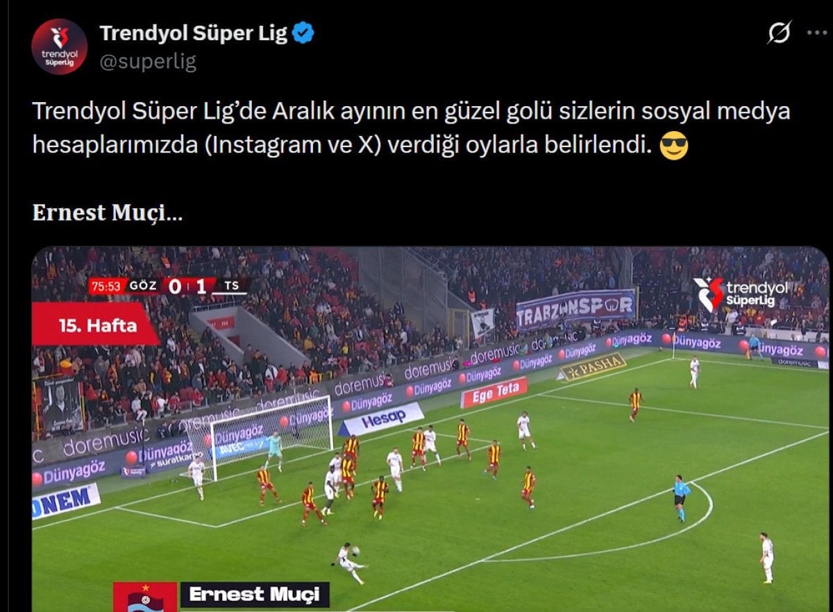 Taraftarların oylaması sonucu Trabzonspor’un Göztepe’yi deplasmanda 2-1 yendiği maçta Ernest Muçi’nin attığı gol birinci seçildi.