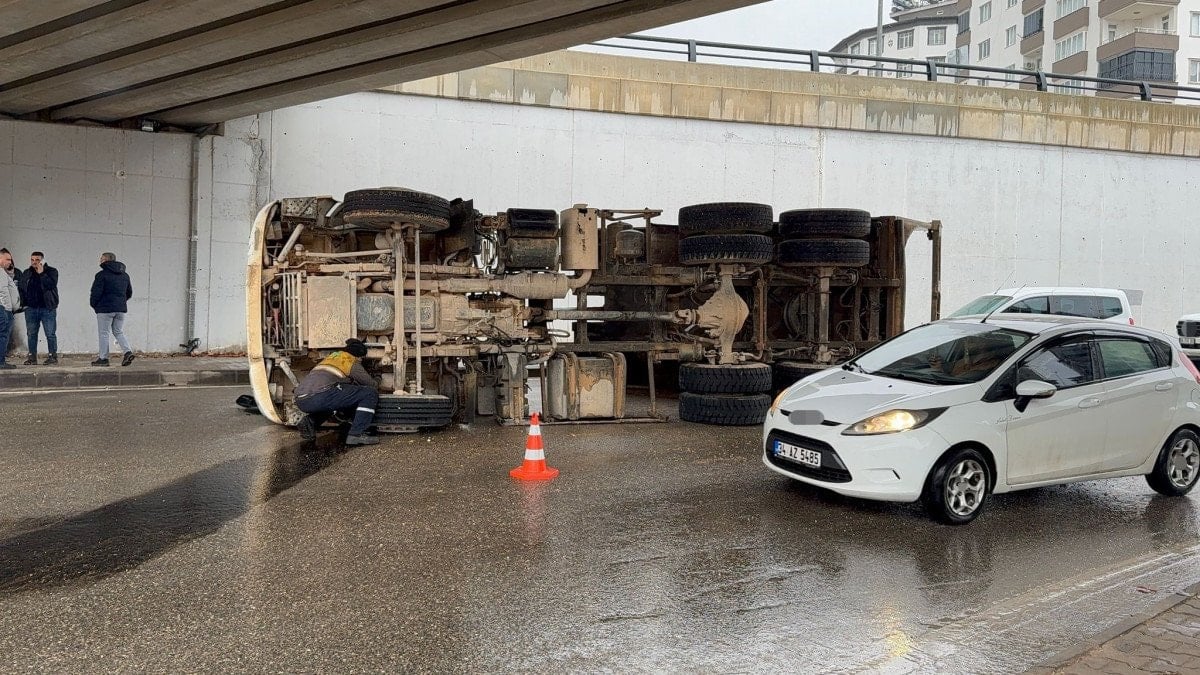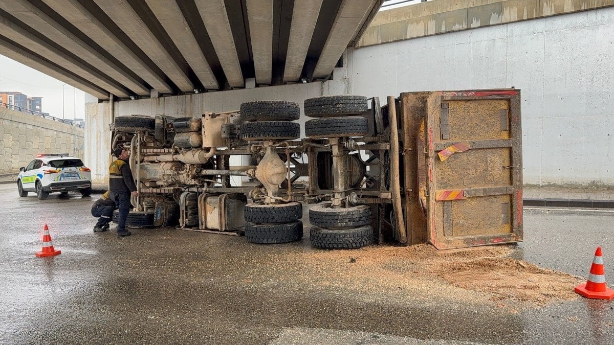 Gaziantep’in Şehitkamil ilçesi Mustafa Taşar Caddesi’nde, plakası ve sürücüsü henüz öğrenilemeyen kamyonun damperi, bilinmeyen bir nedenle seyir halindeyken açıldı. Açık damperin köprüye çarpmasıyla birlikte sürücünün direksiyon hakimiyetini kaybettiği kamyon yan yatarak durabildi.