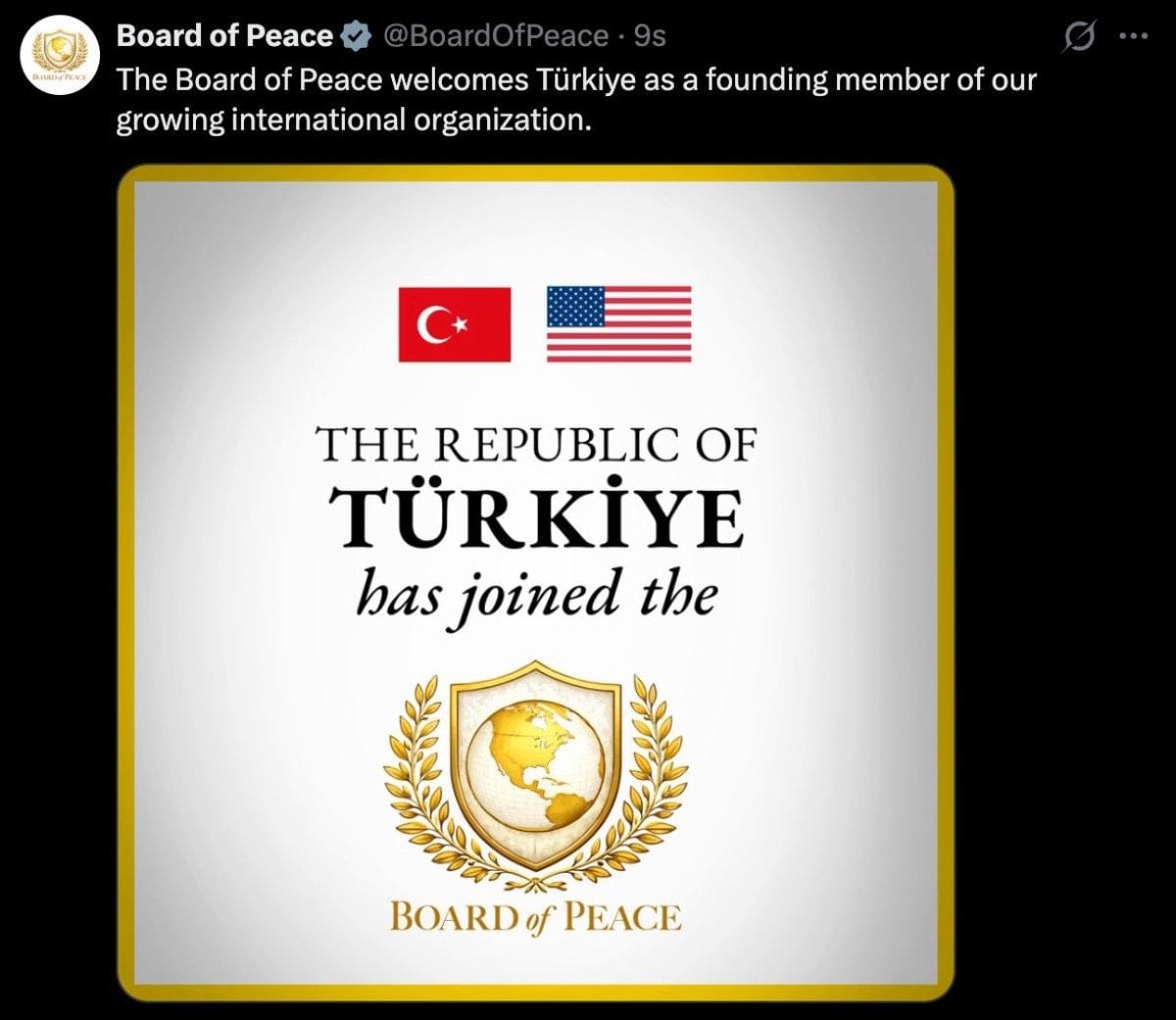 Trump, Gazze’nin yeniden imarı ve güvenliğinden sorumlu olacak Barış Kurulu’na Türkiye’yi kurucu üye olarak davet etmiş, Cumhurbaşkanı Recep Tayyip Erdoğan da bu daveti kabul etmişti. Kurulun kuruluş sözleşmesi, Trump’ın başkanlığında 19 ülkenin temsilcileri tarafından imzalandı.