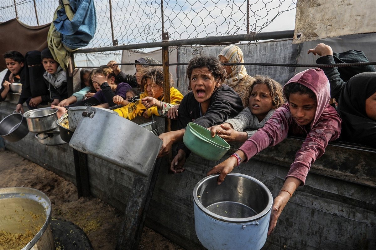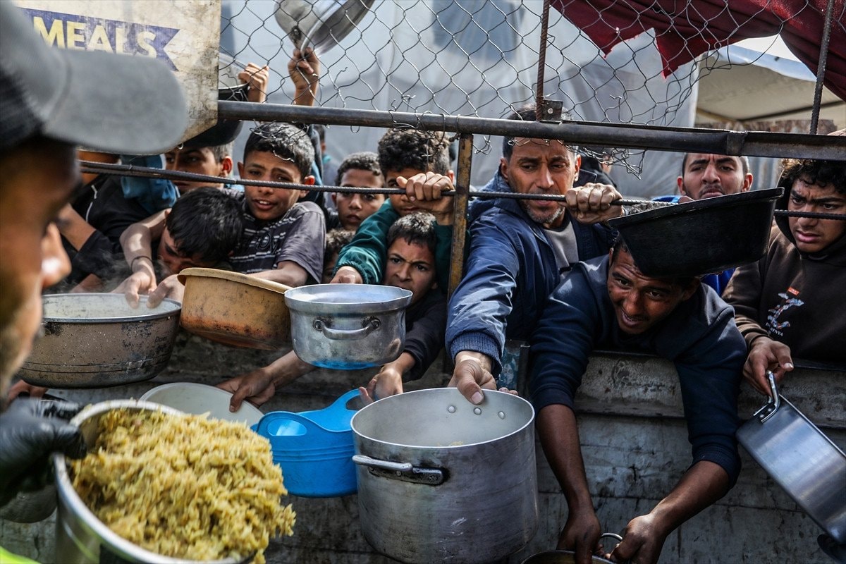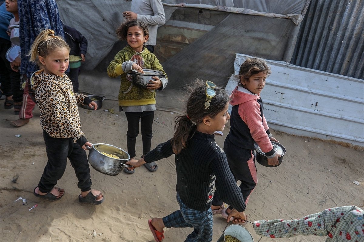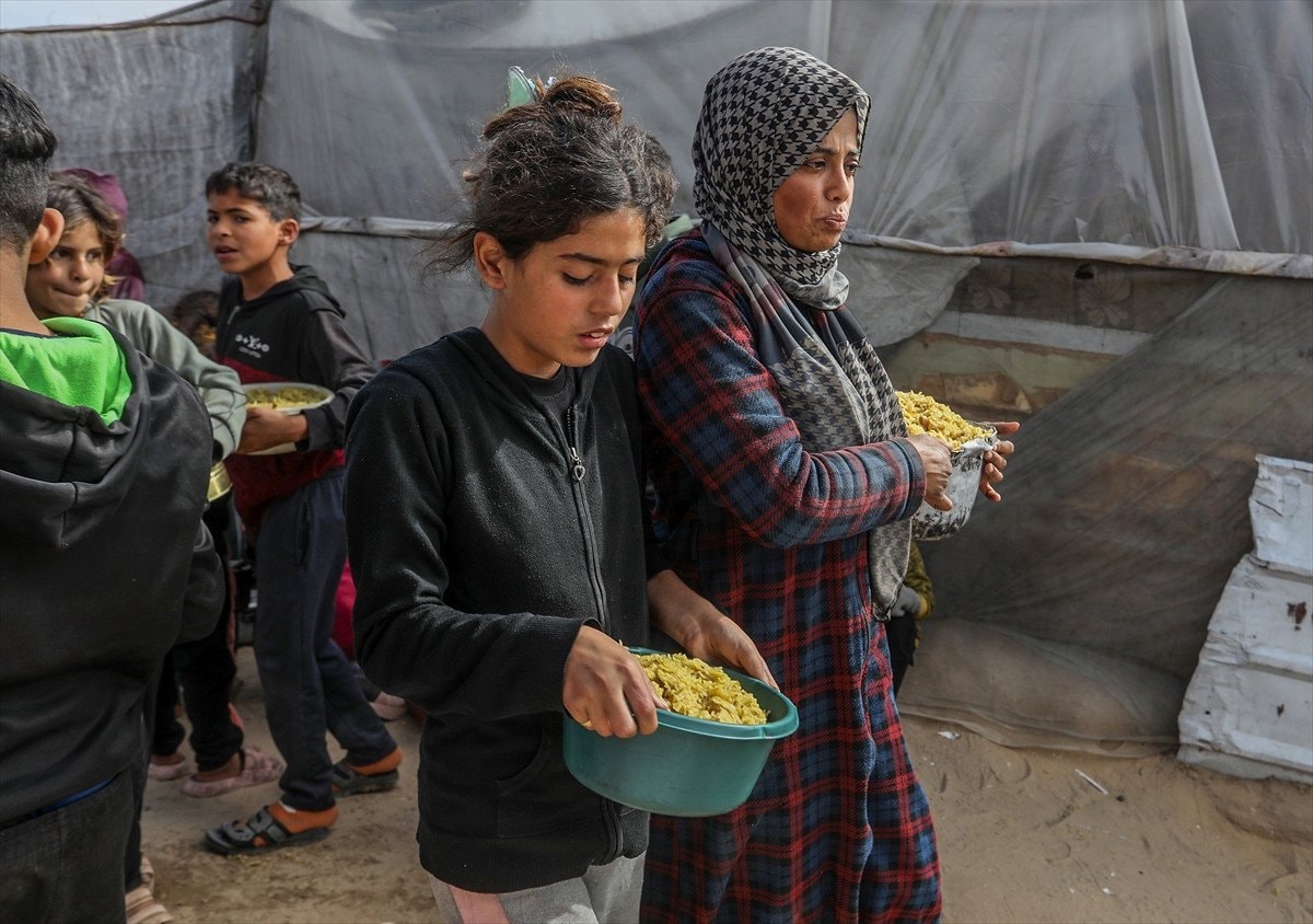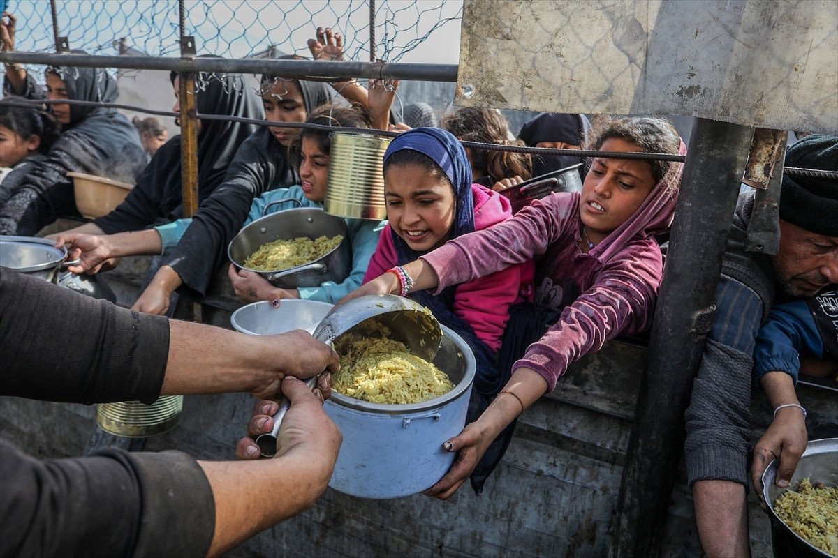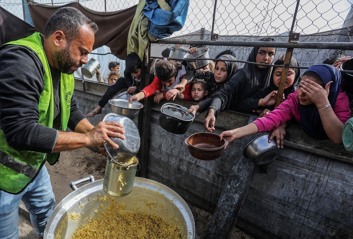 Gazze Şeridi’nin güneyindeki Han Yunus kentinin Mevasi bölgesinde yaşayan yüzlerce yerinden edilmiş Filistinli, bir öğün sıcak yemek alabilmek için kurulan hayır mutfaklarının önünde uzun kuyruklar oluşturuyor.