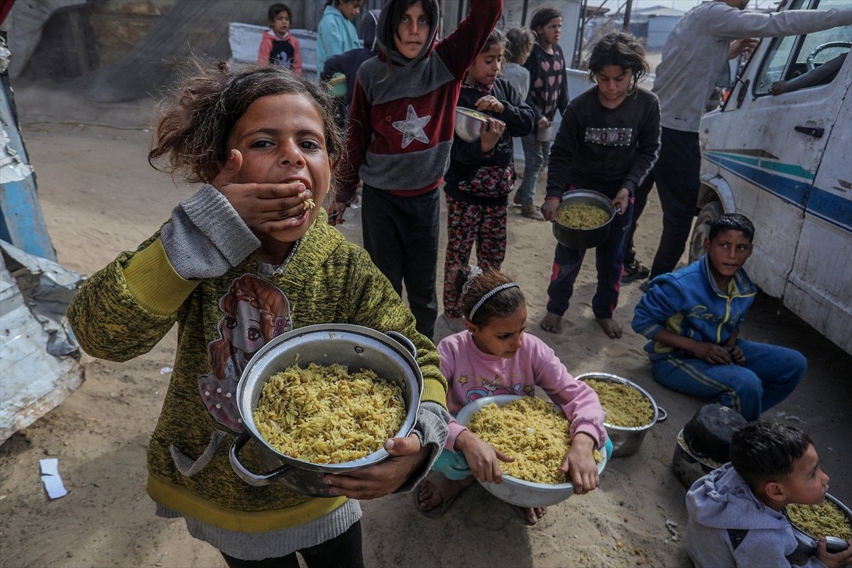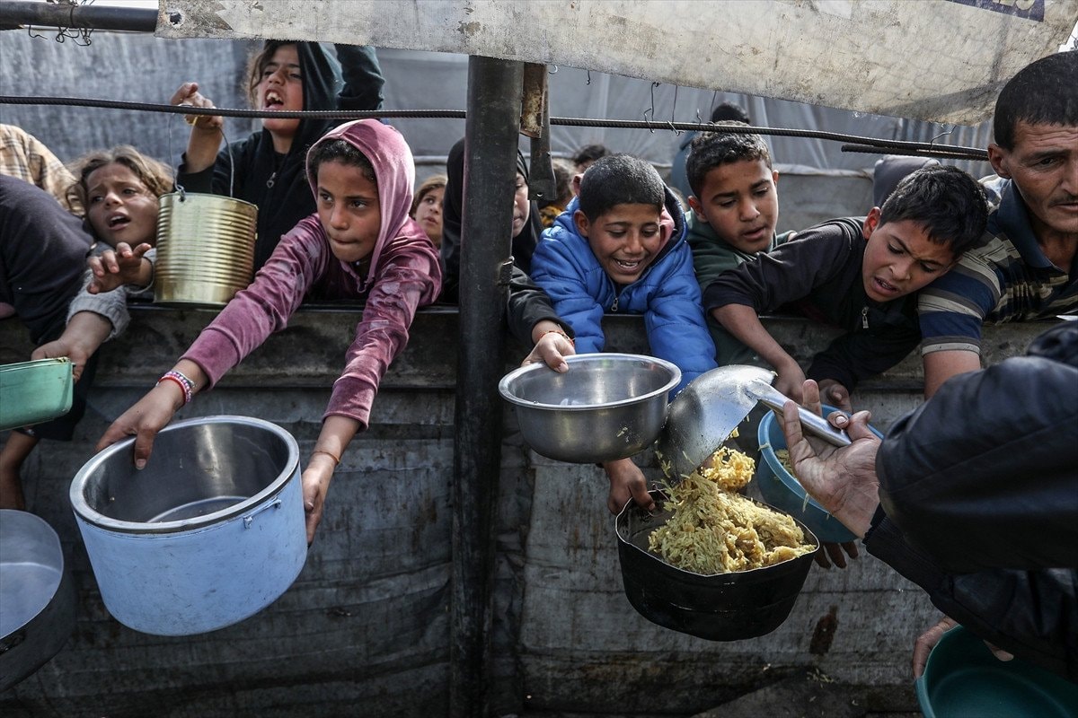 Sıcak yemek dağıtımı için saatlerce sıra bekleyen Filistinliler, çoğu zaman çocuklarının karnını doyurmaya yetecek tek bir öğünle yetinmek zorunda kalıyor.