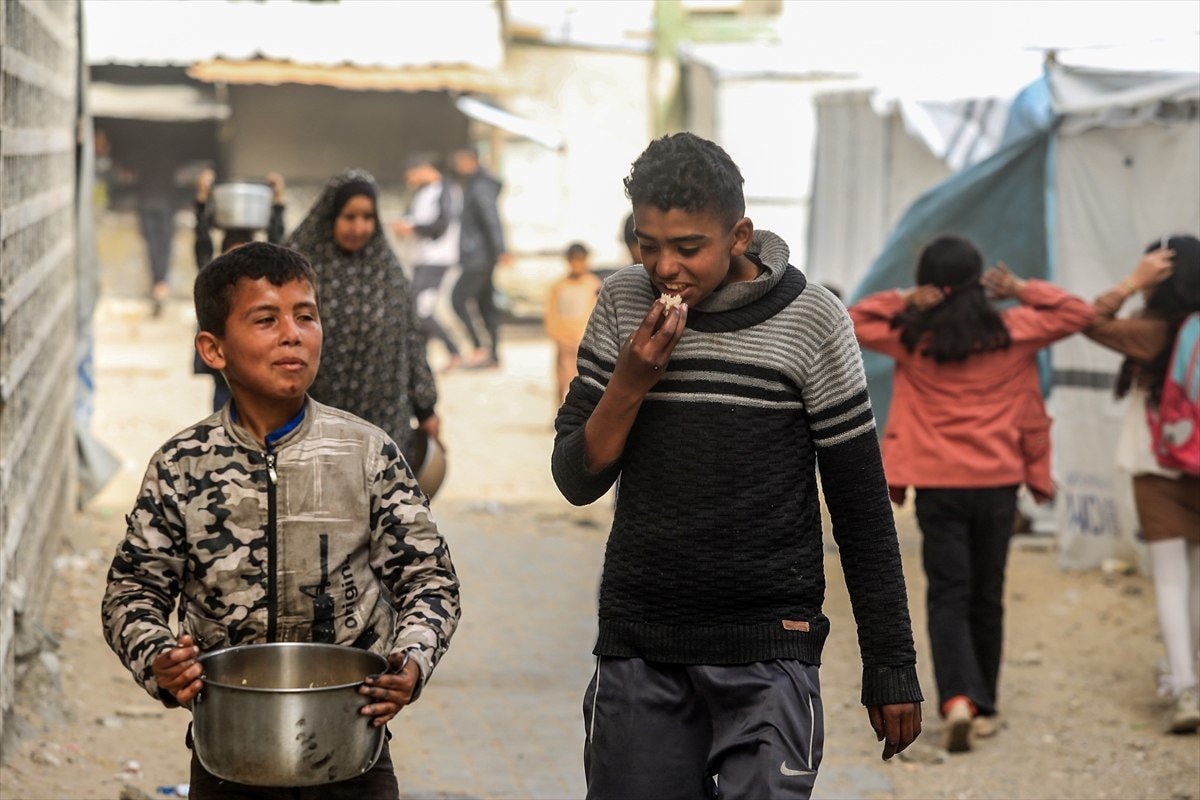 Yemekten almak isteyen ve aralarında çocukların da bulunduğu çok sayıda Filistinli, bir kap yemeğe ulaşabilmek için soğuk havaya rağmen yoğunluk oluşturdu.