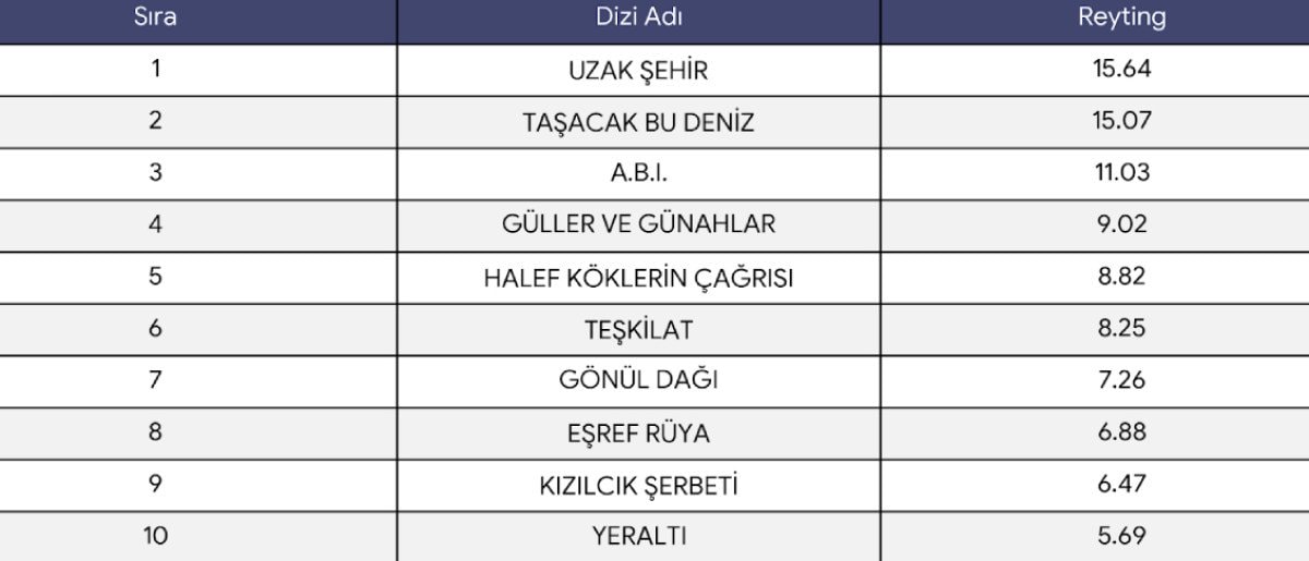 Geçen Haftanın Reyting Galibi Belli Oldu: A.B.İ., Uzak Şehir, Taşacak Bu Deniz…