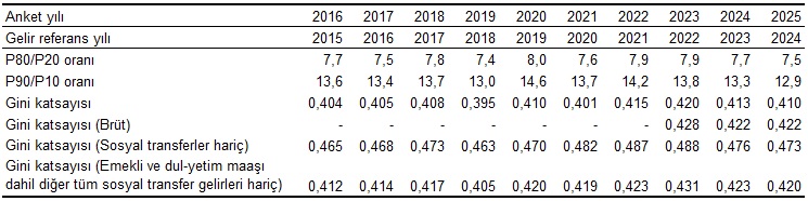 Daha önceki yıllardan farklı olarak 2025 yılı sonuçları ile birlikte, idari kayıtlardan elde edilen vergi ve sosyal güvenlik priminin net kullanılabilir gelire dahil edilmesi ile elde edilen brüt gelir için Gini katsayısı hesaplandı.