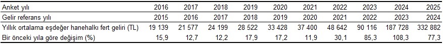 Gelir Dağılımı İstatistiklerinin hesaplandığı Gelir ve Yaşam Koşulları Araştırması 2025 yılı sonuçlarına ilişkin gelir bilgileri, bir önceki takvim yılı olan 2024 yılını referans almaktadır. Gelir hesaplamalarında hanehalkı gelirleri; hanehalkı büyüklüğü ve kompozisyonu dikkate alınarak eşdeğer hanehalkı kullanılabilir fert gelirine dönüştürülmektedir.
