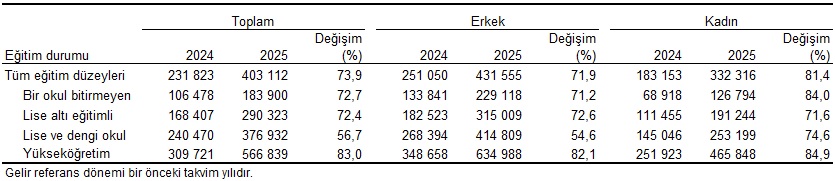 Eğitim durumuna göre yıllık ortalama esas iş gelirleri sırasıyla yükseköğretim mezunlarında 566 bin 839 TL, lise ve dengi okul mezunlarında 376 bin 932 TL, lise altı eğitimlilerde 290 bin 323 TL, bir okul bitirmeyenlerde 183 bin 900 TL olarak hesaplandı. Geçen yıla göre yıllık ortalama esas iş gelirinde en yüksek artış %83,0 ile yükseköğretim, en düşük artış ise %56,7 ile lise ve dengi okul mezunlarında oldu.