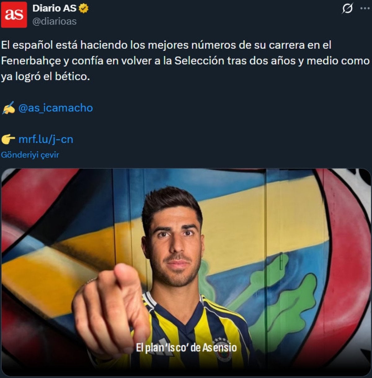 Asensio’nun, milli takıma geri dönmek istediği belirtildi ve “Marco Asensio, Fenerbahçe’de kariyerinin en iyi istatistiklerini elde ediyor ve 2,5 yıl sonra milli takıma geri döneceğinden emin.” ifadeleri yer aldı.