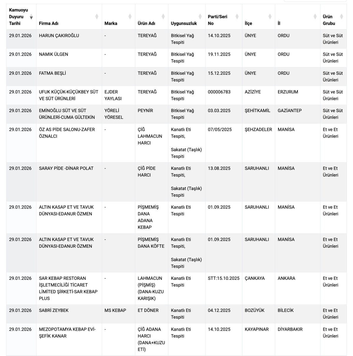 Tarım ve Orman Bakanlığı’nın 29 Ocak 2026 tarihli denetim sonuçları, gıda ürünlerinde ciddi uygunsuzlukları ortaya koydu. Denetimlerde; et ve et ürünlerinde kanatlı eti ile sakatat kullanımı tespit edilirken, baharatlarda ise domates karıştırılması ve gıdada kullanımına izin verilmeyen boya maddelerine rastlandı.