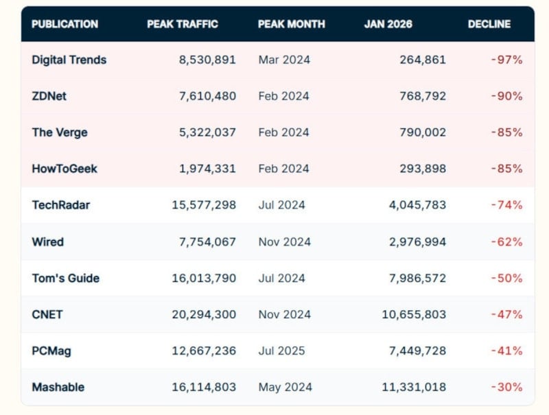 SEO uzmanı Growtika tarafından yapılan araştırma kapsamında 2024 yılının başından 2026 yılının başına kadar olan süreçte 10 büyük teknoloji haber sitesinin verileri mercek altına alındı.