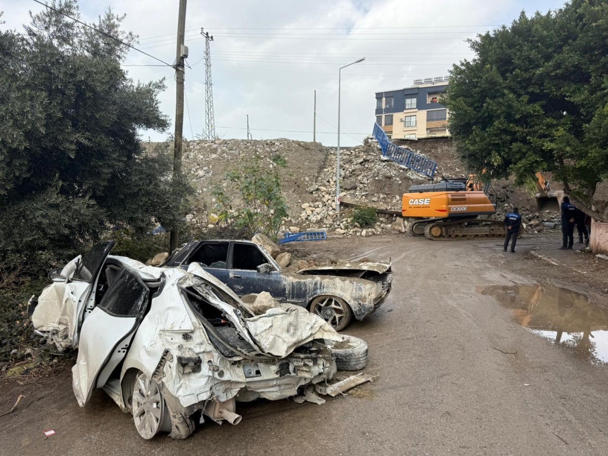 Hatay’da istinat duvarı çöktü: Park halindeki araçlar hurdaya döndü