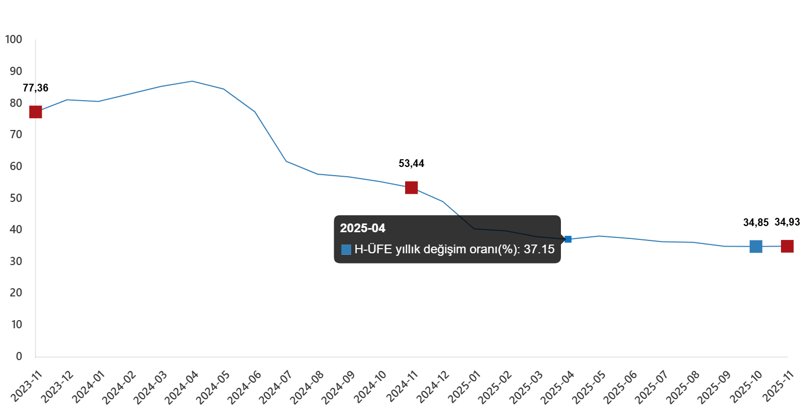H-ÜFE 2025 yılı Kasım ayında bir önceki aya göre %0,70 azalış, bir önceki yılın Aralık ayına göre %34,07 artış, bir önceki yılın aynı ayına göre %34,93 artış ve on iki aylık ortalamalara göre %37,71 artış gösterdi.