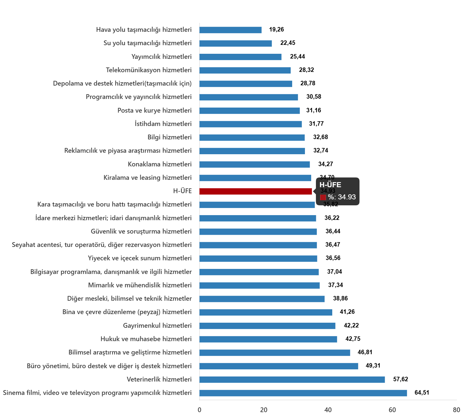 Bir önceki yılın aynı ayına göre, ulaştırma ve depolama hizmetlerinde %31,51 artış, konaklama ve yiyecek hizmetlerinde %36,00 artış, bilgi ve iletişim hizmetlerinde %35,19 artış, gayrimenkul hizmetlerinde %42,22 artış, mesleki, bilimsel ve teknik hizmetlerde %39,35 artış, idari ve destek hizmetlerde %38,49 artış gerçekleşti.