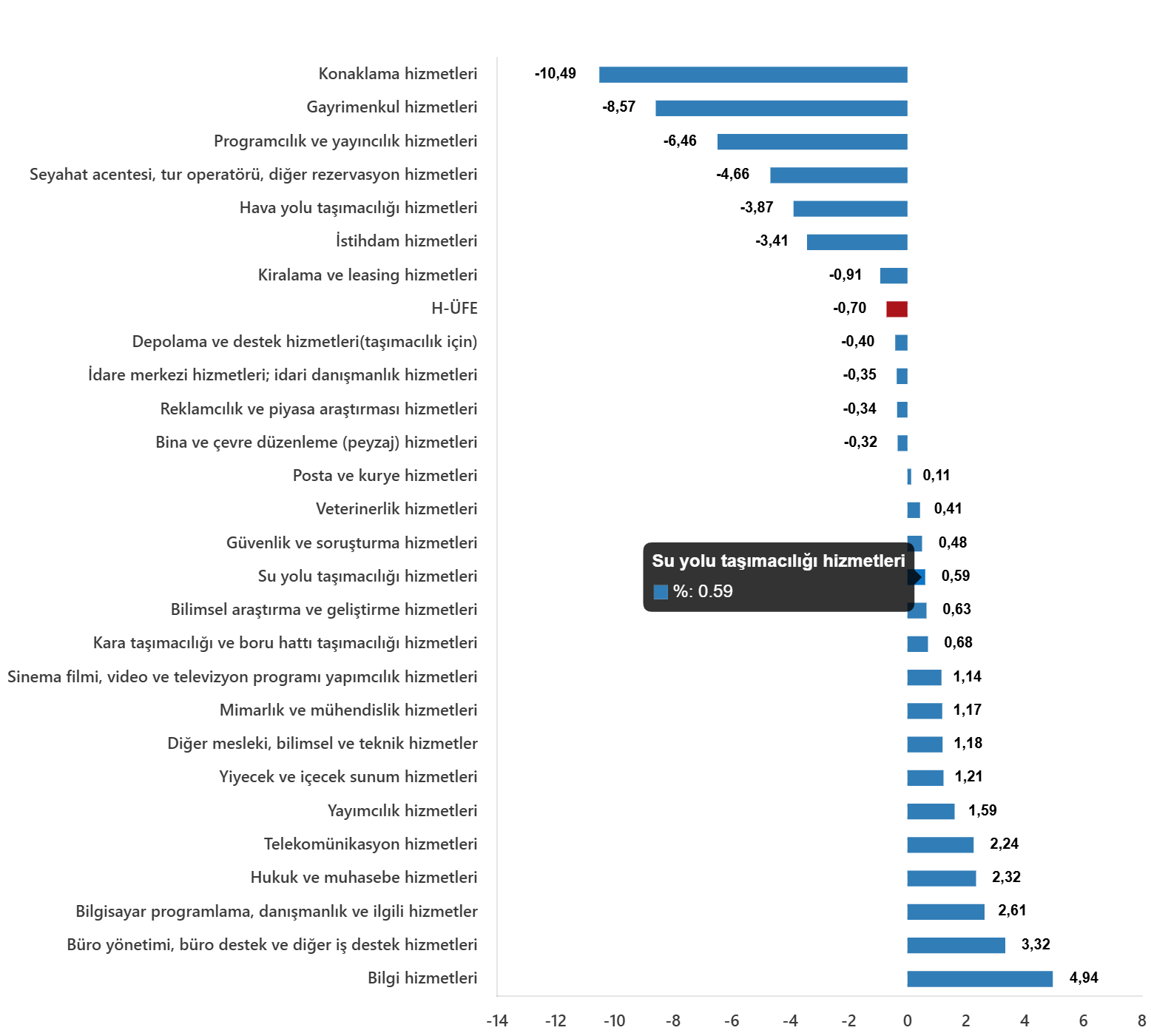 Bir önceki aya göre, ulaştırma ve depolama hizmetlerinde %0,09 azalış, konaklama ve yiyecek hizmetlerinde %1,91 azalış, bilgi ve iletişim hizmetlerinde %2,15 artış, gayrimenkul hizmetlerinde %8,57 azalış, mesleki, bilimsel ve teknik hizmetlerde %0,75 artış, idari ve destek hizmetlerde %1,29 azalış gerçekleşti.