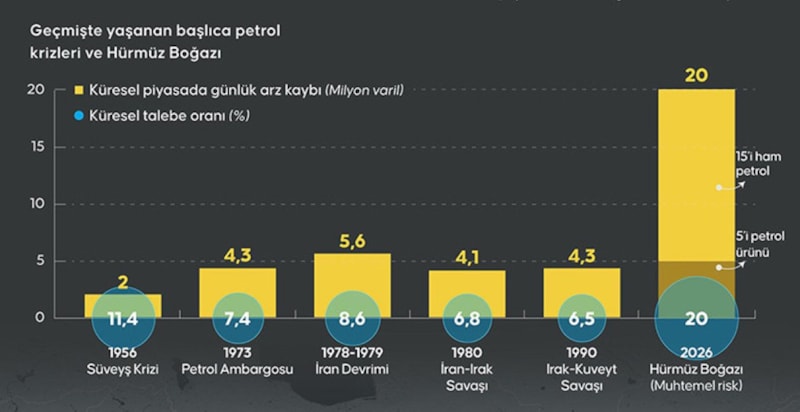 Geçmişte yaşanan başlıca petrol krizleri açısından Hürmüz Boğazı’na bakıldığında 1956 Süveyş Krizinde küresel piyasada günlük arz kaybı 2 milyon varil ve küresel talebe oranı yüzde 11,4 iken, 2026’daki küresel piyasada günlük arz kaybı 20 milyon varil ve küresel talebe oranı yüzde 20 oldu.