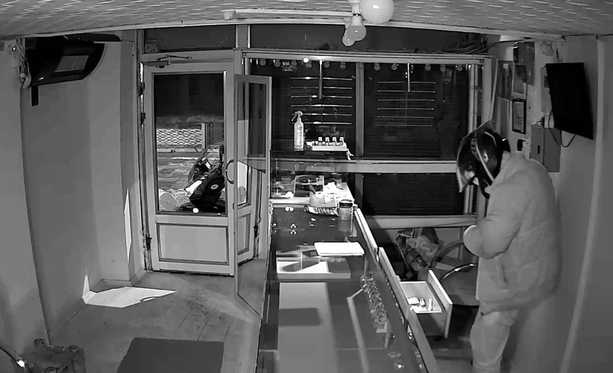 Kaskını düzelttikten sonra tezgahın arkasına geçen şüpheli, cep telefonunun ışığıyla çekmeceleri tek tek açarak yaklaşık 5,5 kilo altını çalarak uzaklaştı.