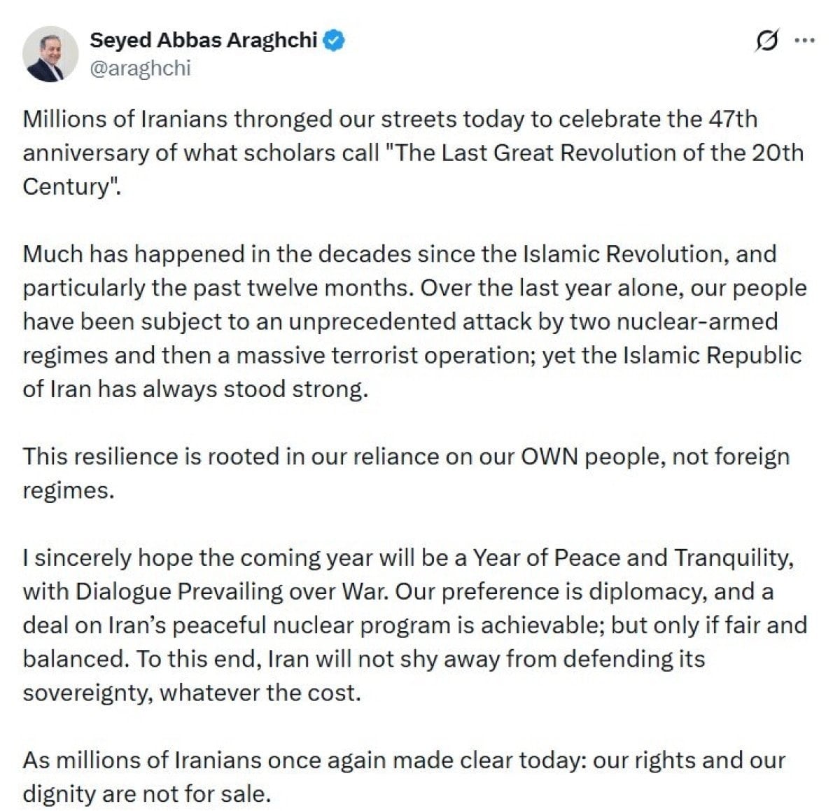 Milyonlarca İranlının uzmanların “20. yüzyılın son büyük devrimi” olarak adlandırdığı İran İslam Devrimi’nin 47’nci yıldönümünü kutlamak için sokaklara döküldüğünü belirten Arakçi, “İslam Devrimi’nden bu yana geçen on yıllarda, özellikle de son 12 ayda çok şey yaşandı. Sadece geçen yıl içinde halkımız 2 nükleer silahlı rejimin eşi benzeri görülmemiş saldırılarına ve ardından büyük çaplı bir terörist operasyona maruz kaldı. Ancak İran İslam Cumhuriyeti her zaman güçlü durdu” değerlendirmesinde bulundu.