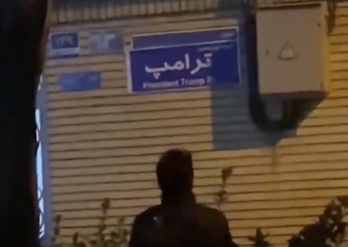 Elinde Farsça ve İngilizce ‘Başkan Trump Sokağı’ yazan bir afişi orijinal sokak tabelası üzerine yapıştıran göstericinin o anları dikkat çekti.