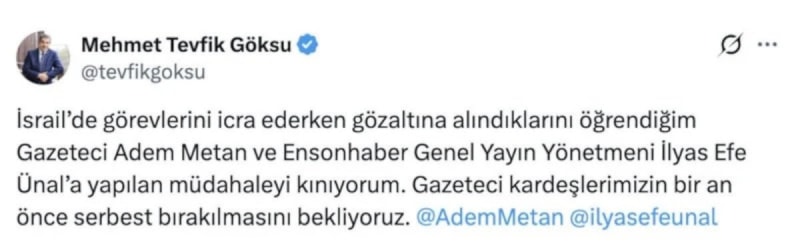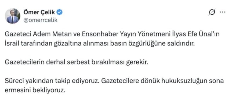 AK Parti Sözcüsü Ömer Çelik, İsrail’in kararına sert tepki göstererek “Gazeteci Adem Metan ve Ensonhaber Yayın Yönetmeni İlyas Efe Ünal’ın İsrail tarafından gözaltına alınması basın özgürlüğüne saldırıdır.