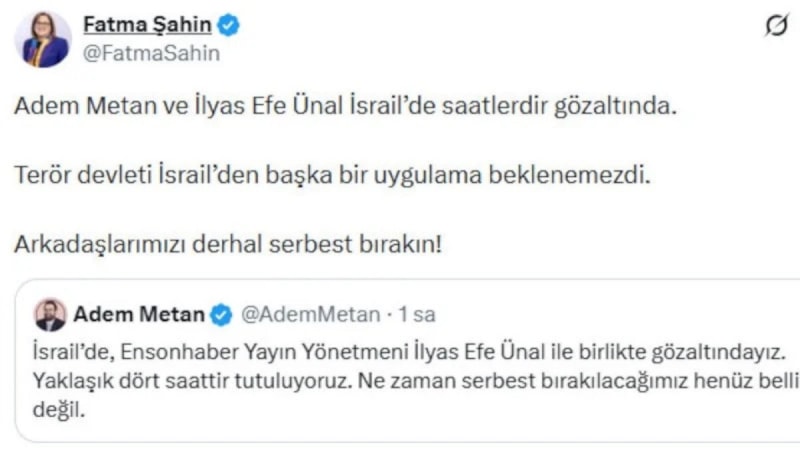 Gaziantep Büyükşehir Belediye Başkanı Fatma Şahin de gözaltı kararına tepki göstererek “Adem Metan ve İlyas Efe Ünal İsrail’de saatlerdir gözaltında.