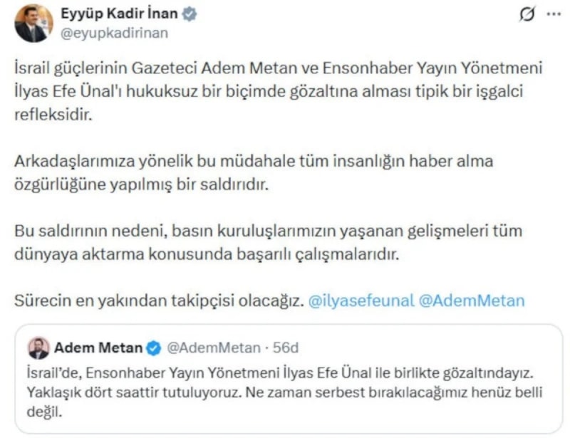 İsrail’de gözaltına alınan Gazeteci Adem Metan ve Ensonhaber Yayın Yönetmeni İlyas Efe Ünal’a yönelik bu müdahale hukuksuz ve kabul edilemez bir saldırıdır.