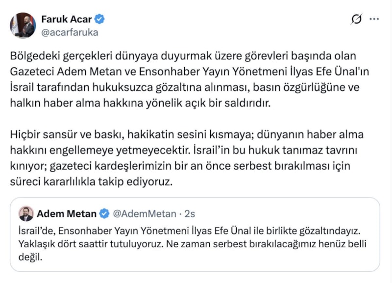 Gözaltı kararına sert tepki gösteren Acar, “Bölgedeki gerçekleri dünyaya duyurmak üzere görevleri başında olan Gazeteci Adem Metan ve Ensonhaber Yayın Yönetmeni İlyas Efe Ünal’ın İsrail tarafından hukuksuzca gözaltına alınması, basın özgürlüğüne ve halkın haber alma hakkına yönelik açık bir saldırıdır.