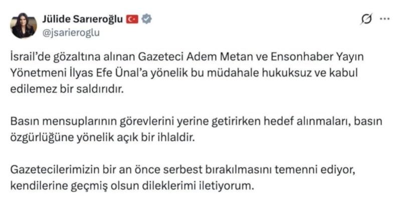 Hiçbir sansür ve baskı, hakikatin sesini kısmaya; dünyanın haber alma hakkını engellemeye yetmeyecektir. İsrail’in bu hukuk tanımaz tavrını kınıyor; gazeteci kardeşlerimizin bir an önce serbest bırakılması için süreci kararlılıkla takip ediyoruz.” ifadelerini kullandı.