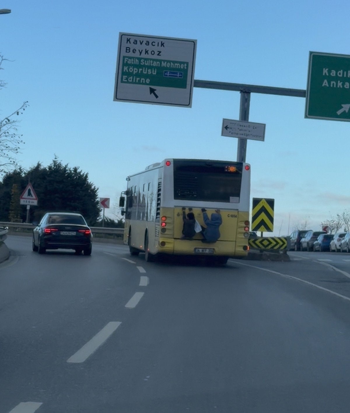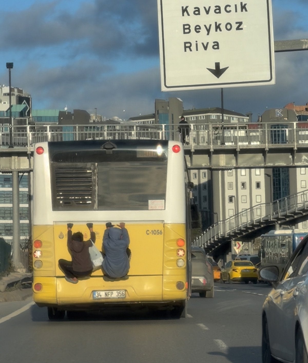 İstanbul’un Beykoz ilçesi Kavacık kavşağında seyir halinde olan İETT otobüsünün bagaj kapağına tutunan 2 çocuk, bir süre bu şekilde yolculuk etti.