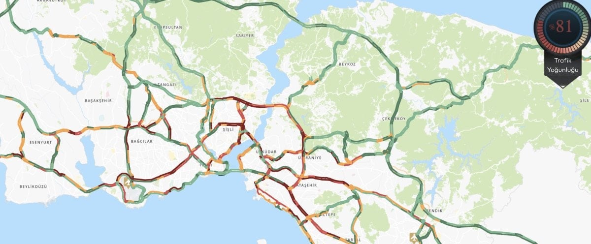 İstanbul Büyükşehir Belediyesi (İBB) trafik yoğunluk haritasına göre, saat 17:45 itibariyle kent genelinde trafik yoğunluğu yüzde 81 olarak ölçüldü.