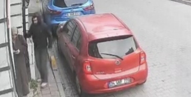 Güvenlik kamerası görüntülerinde, binanın önünde elinde telefonla duran kadına yavaş adımlarla yaklaşan şüpheli, kısa sürede çevreyi kontrol etti.