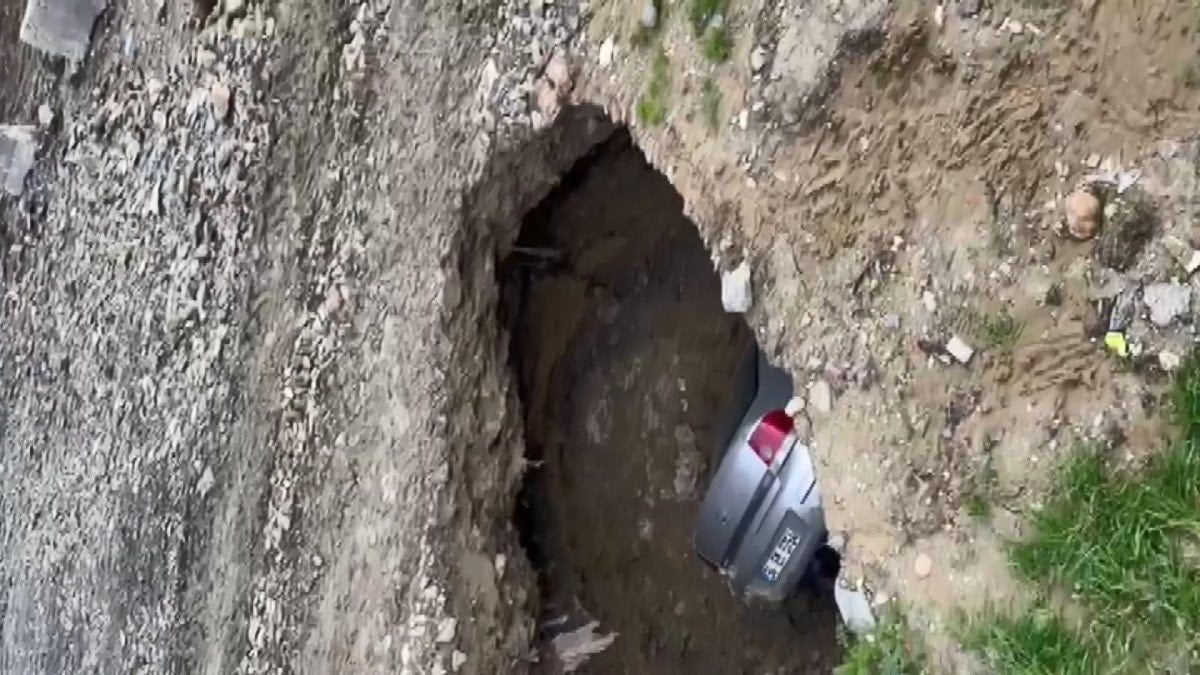 Arazide oluşan göçük nedeniyle park halindeki otomobil, kayan toprakla birlikte çukurun içine düştü.