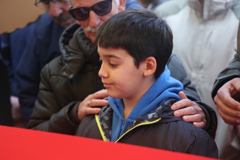 Namaz öncesi Fatma Nur öğretmenin çocuğu da bir yakını ile tabutun başına geldi.