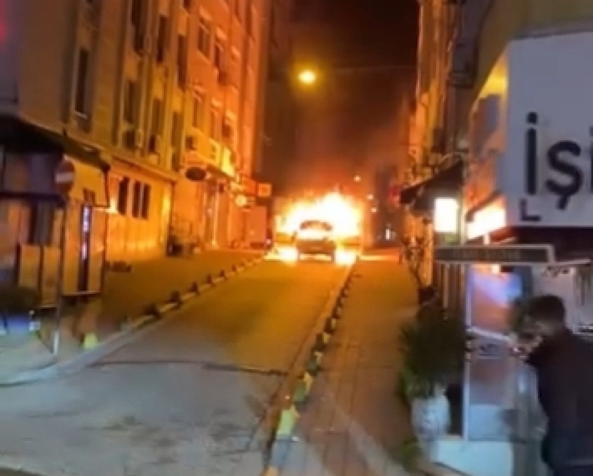 Sokak üzerinde park halinde bulunan hafif ticari araç, henüz bilinmeyen bir nedenle alev aldı.