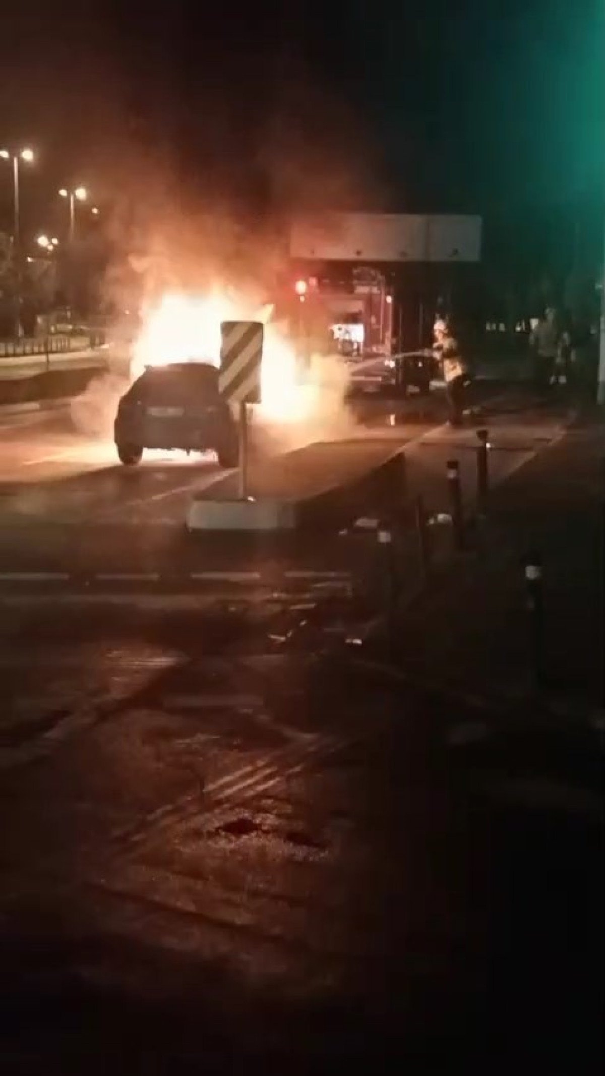 İtfaiye ekipleri yanan otomobile müdahale ederken polis ekipleri, trafik akışını tek şeritten kontrollü şekilde sağladı.