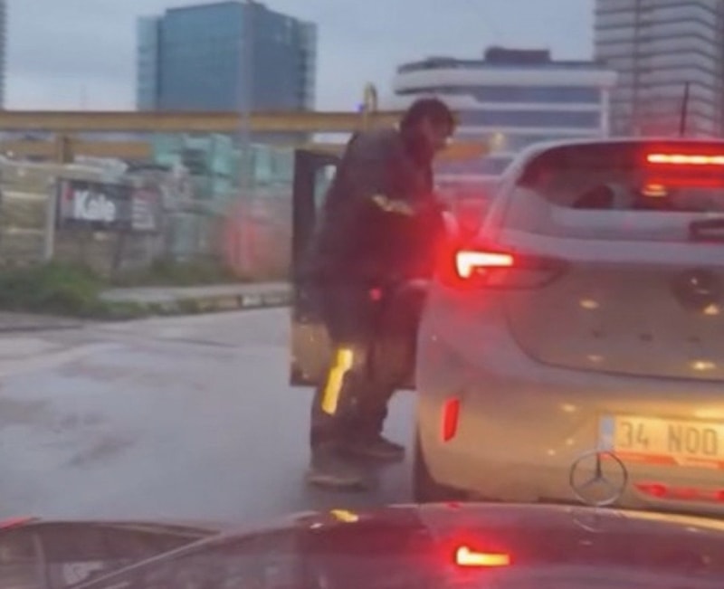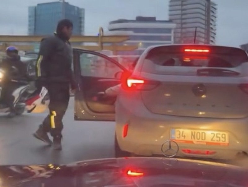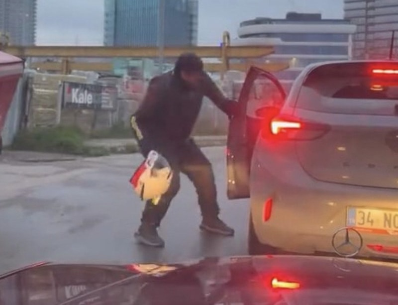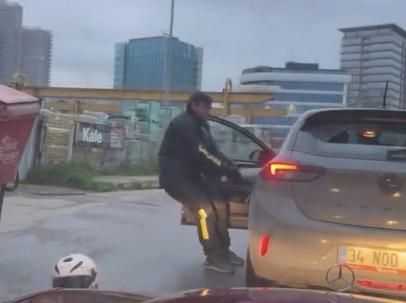 Aracından inen motosiklet sürücüsü, kapısını zorla açtığı otomobilin sürücüsünü kolundan tutarak aşağı indirmeye çalıştı.
