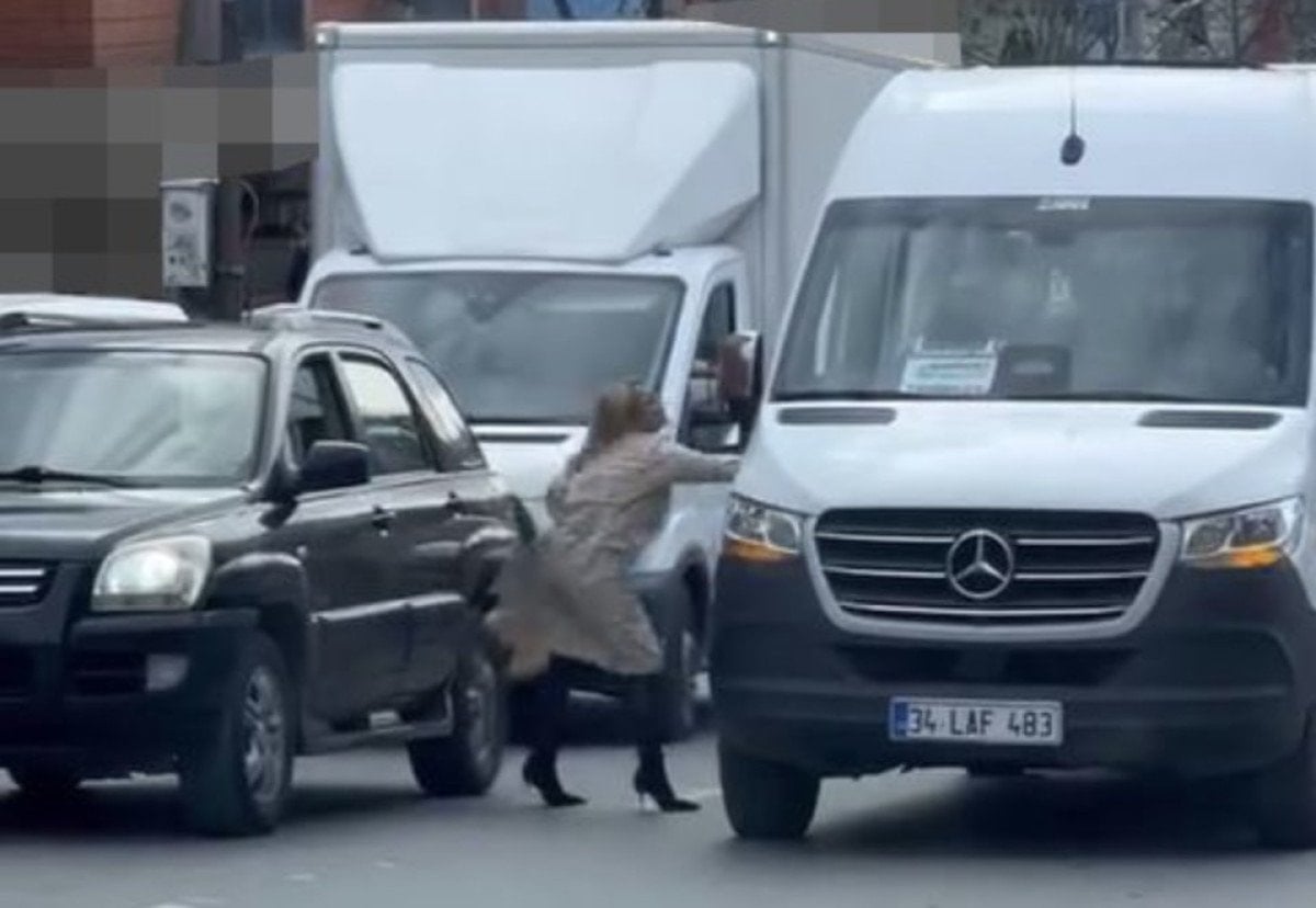 Hakareti duyan kadın sürücü, aracından inerek servis aracındaki kişilere doğru yöneldi ve saldırmaya başladı.