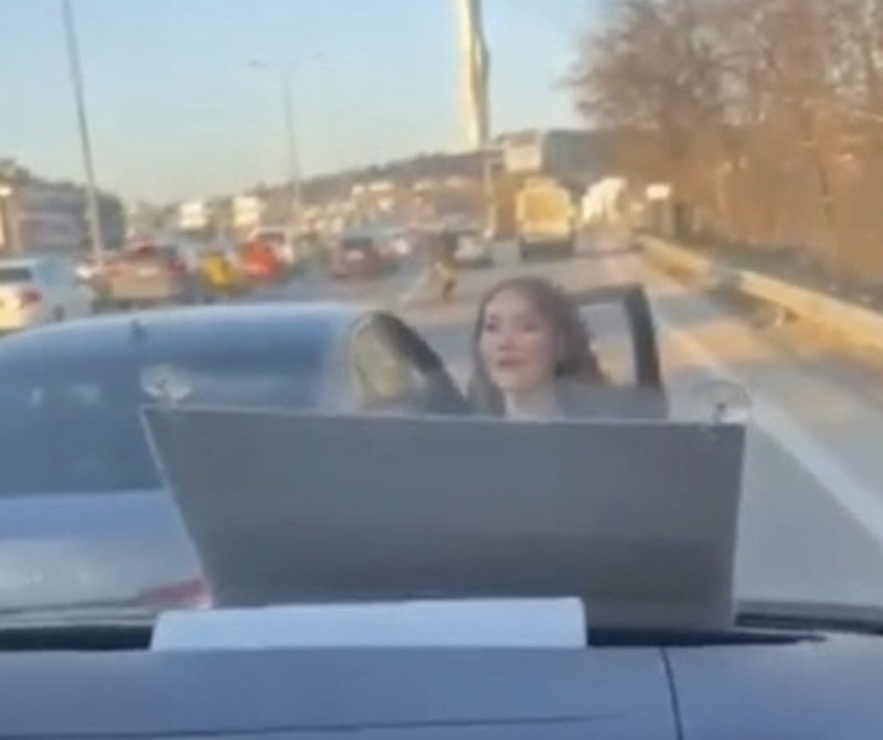 Daha sonra aracından inen sürücü yanındaki kadının engellemelerine rağmen şoföre küfür ve hakaret etti.