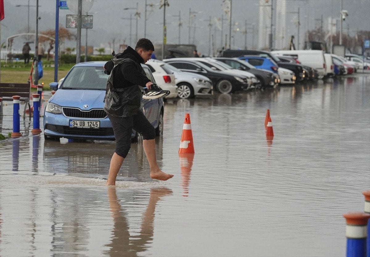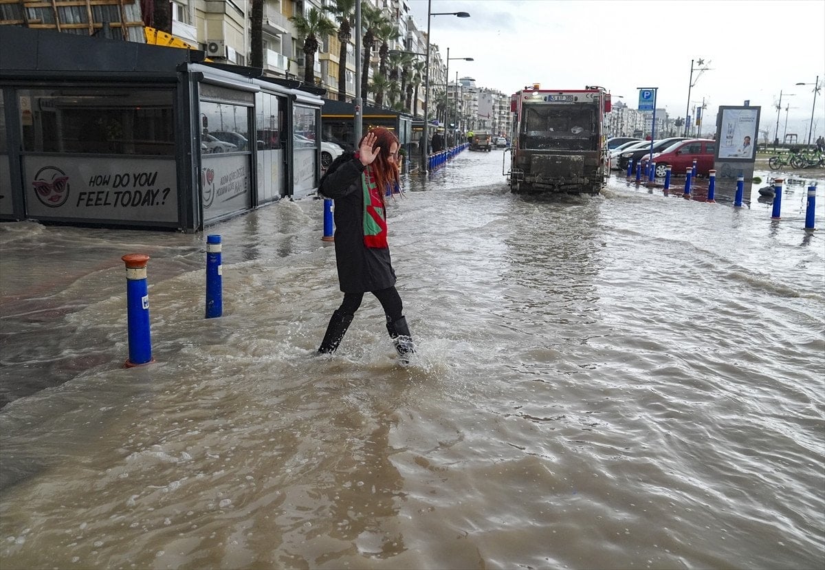 İzmir’de etkili olan sağanak yağışın ardından sokak ve caddeler göle döndü