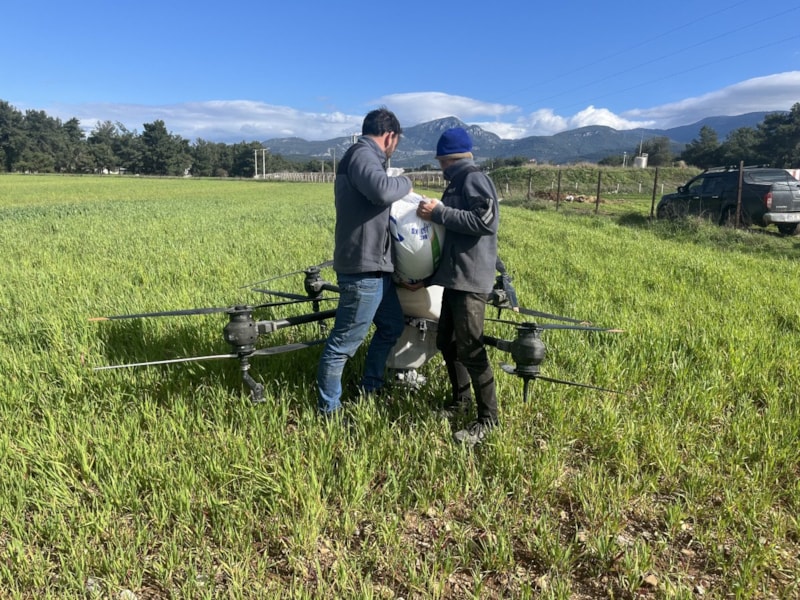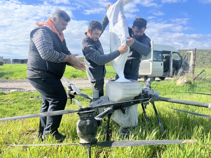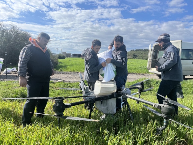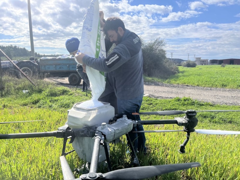 Geniş arazilerde mahsuller, havadan uçurulan dronelarla kısa sürede ve eşit şekilde gübreleniyor. Bu yöntemle hem toprağın zarar görmesi engelleniyor hem de ürünlerin ezilme riski ortadan kalkıyor.