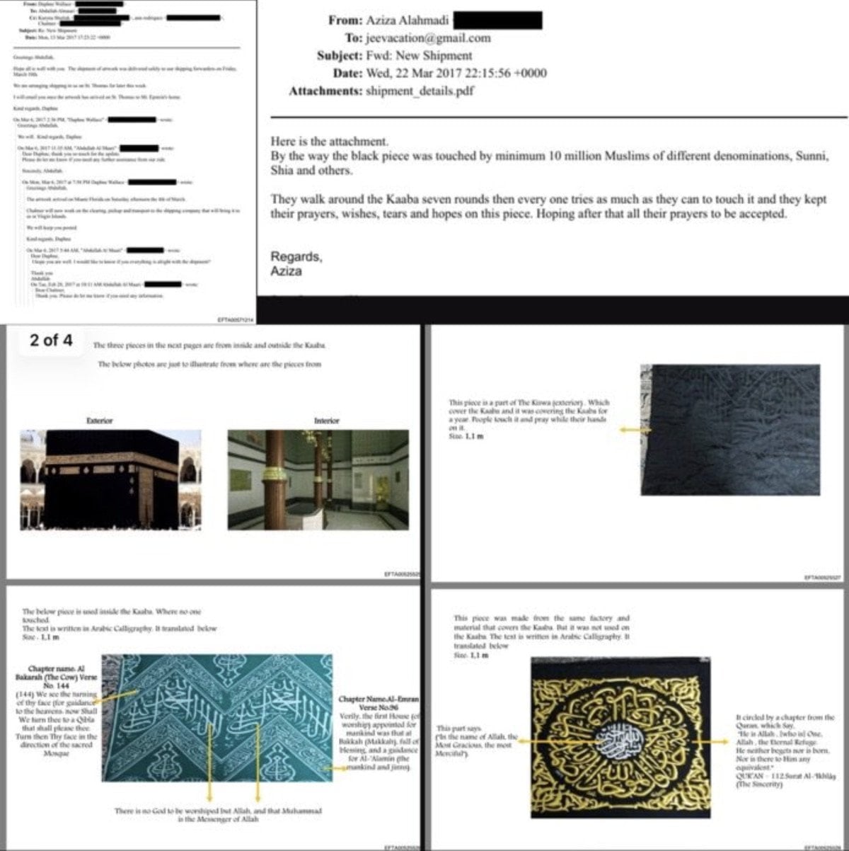 Yayınlanan belgelere göre Aziza Al-Ahmadi, 22 Mart 2017 tarihli bir e-postada Kabe örtüsünün manevi önemini anlattı. Örtünün tavaf sırasında en az 10 milyon Müslüman tarafından dokunulduğunu; dualar, gözyaşları ve umutlar taşıdığını söyledi.