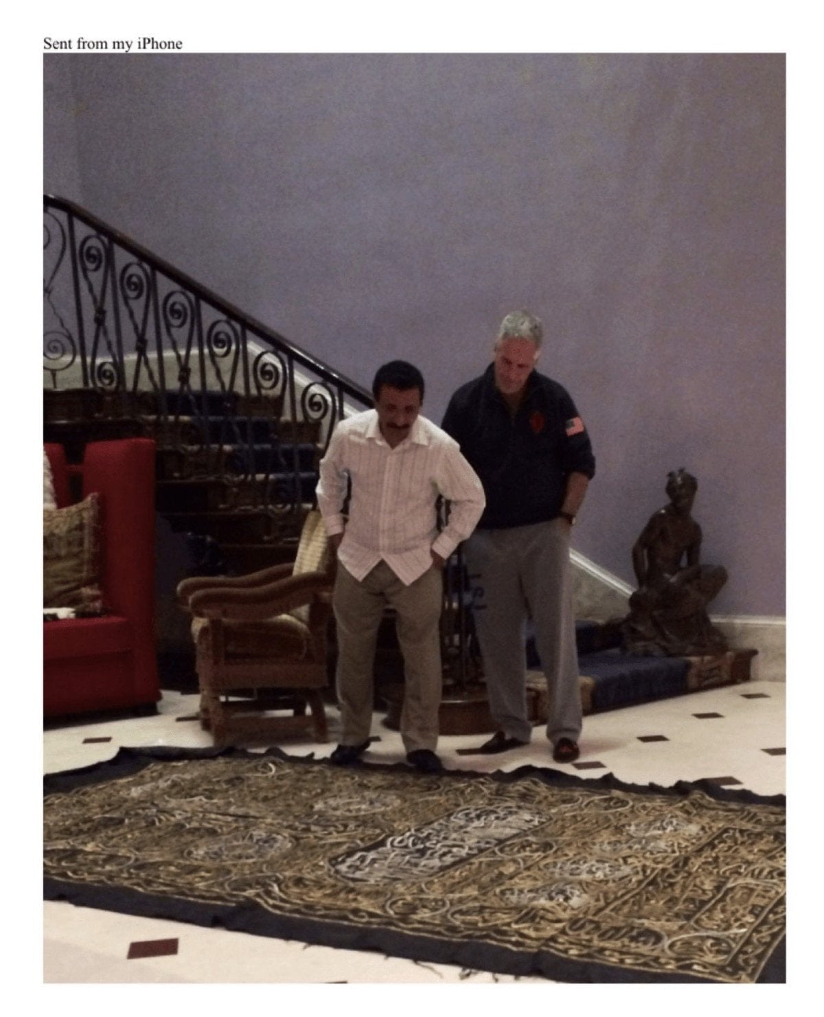 Jeffrey Epstein’in hediye edilen Kabe örtüsünü incelerken çekilmiş fotoğrafı
