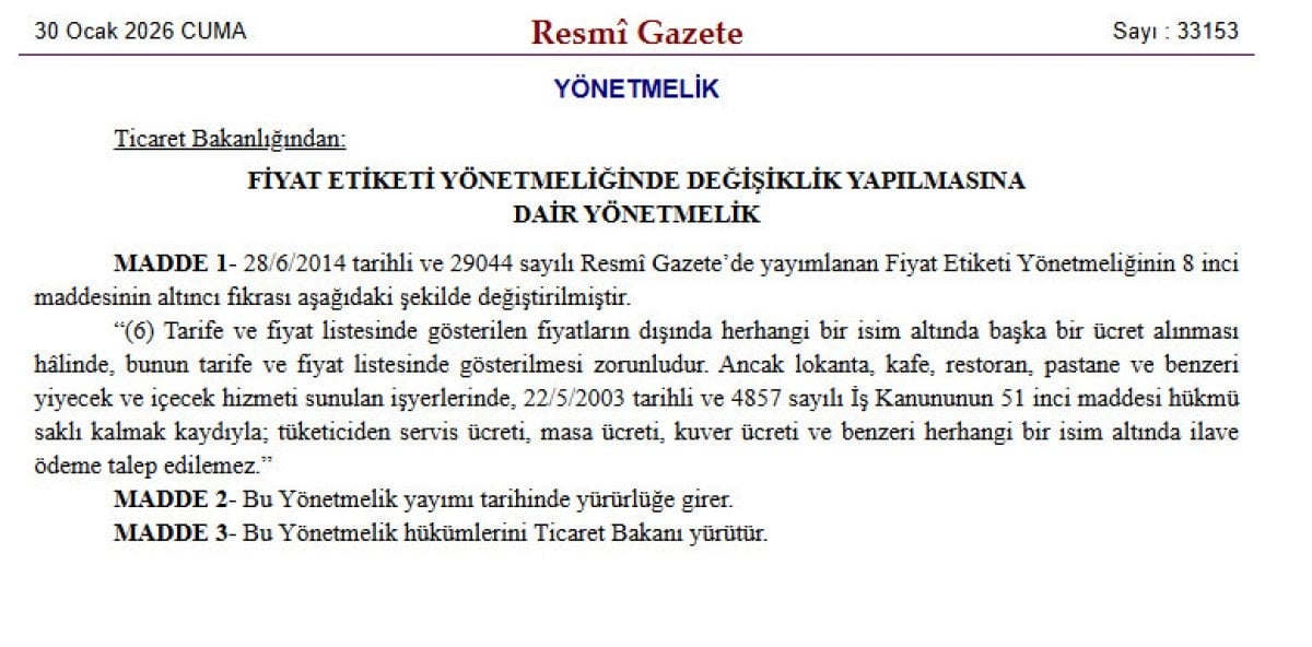 Ticaret Bakanlığı’nın restoran ve kafelerde servis ve kuver ücretini yasaklayan yönetmelik değişikliği, Resmi Gazete’de yayımlanarak yürürlüğe girdi.