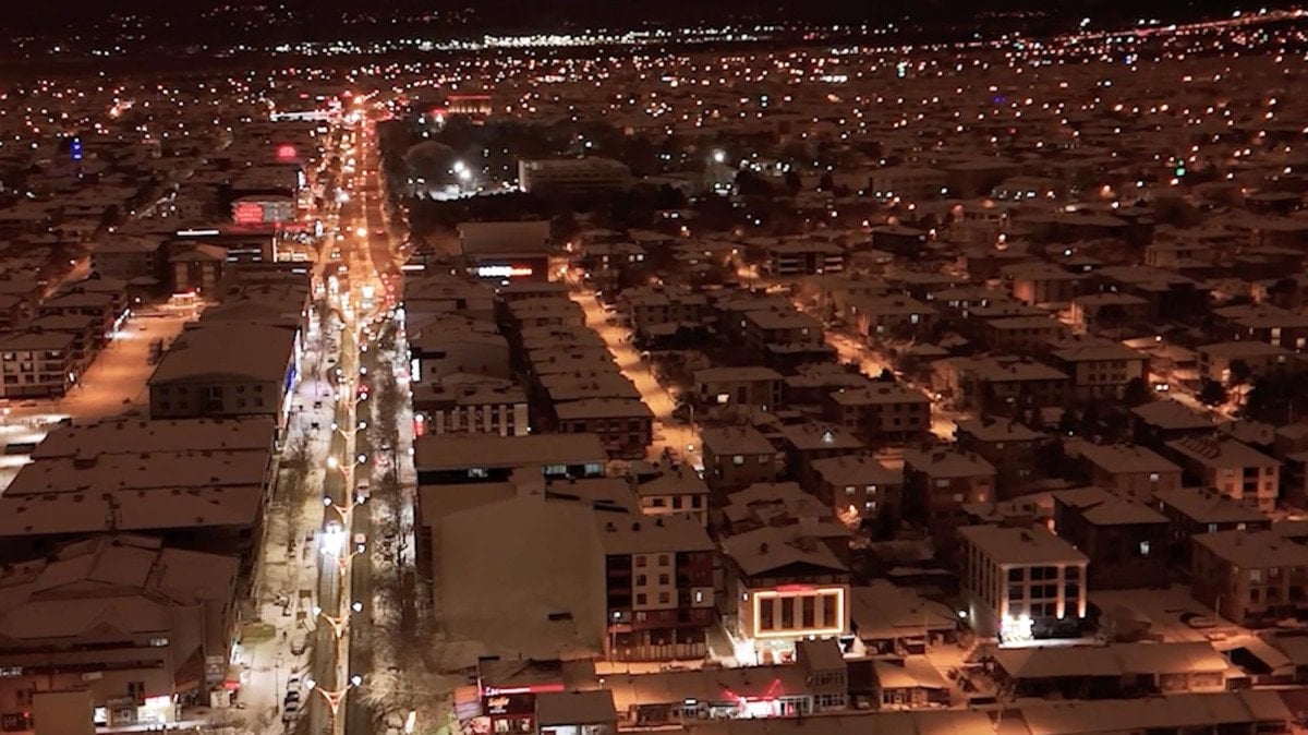 Beyaz örtü ile kaplanan kent merkezi, dronla görüntülendi.
