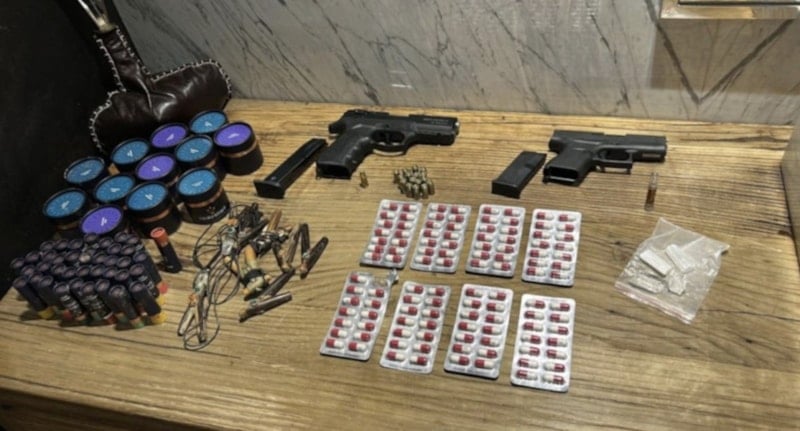 Garipoğlu’nun evinde yapılan aramalarda, 3 ruhsatsız tabanca, 111 adet uyuşturucu hap, 4 parça kristal şeklinde uyuşturucu madde, çok sayıda uyuşturucu madde kullanmaya yarayan aparatlar ve uyuşturucu madde öğütücüsü, 9 deste üstünde ve altında 100’er dolar bulunan boş kağıtlarının bulunduğu deste ve 19 adet orta kısımları kesik sahte dolar ele geçirildi.