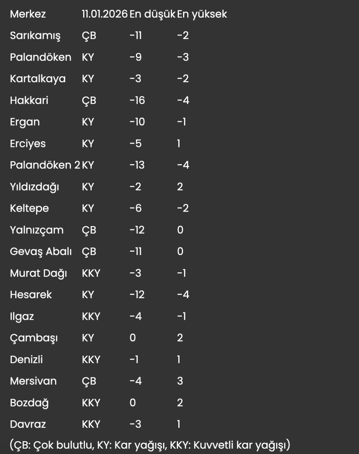 Sarıkamış’ta 206, Palandöken’de 173, Kartalkaya’da 172, Hakkari’de 159, Ergan’da 150, Erciyes’te 107, Palandöken 2 ve Yıldızdağı’nda 80, Keltepe ve Ovacık’ta 75, Kümbet’te 66, Uludağ’da 58, Yalnızçam’da 54, Yedi Kuyular’da 49, Yıldıztepe’de 45, Gevaş Abalı’da 38, Murat Dağı’nda 28, Hesarek’te 26, Ilgaz’da 25, Çambaşı’nda 22, Süleymaniye’de 17, Denizli’de 16, Mersivan’da 11, Bozdağ’da 10, Davraz’da 8 ve Elmadağ’da 4 santimetre ölçüldü.