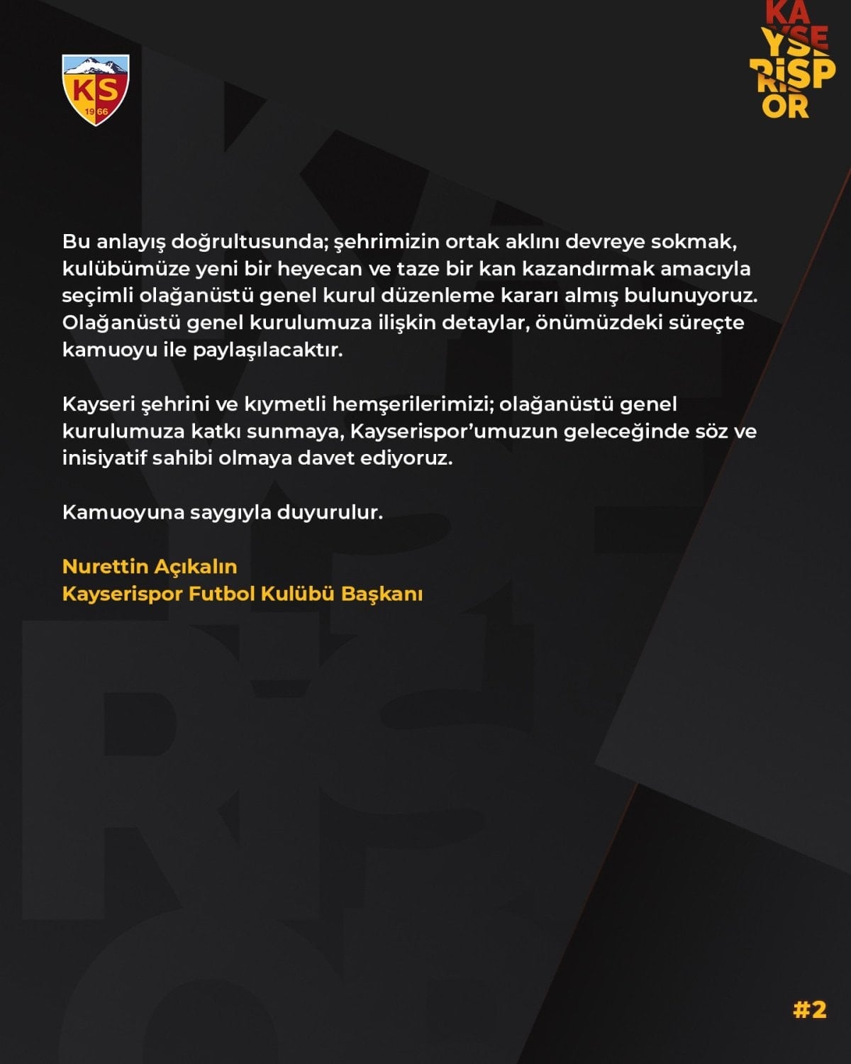 Tüm bu faaliyetler, idari bir planlama çerçevesinde ve kurumsal bir anlayışla yürütülmüştür. Yönetim olarak temel inancımız, başarının da başarısızlığın da şahıslara değil, kulübün tüm paydaşlarına ait olduğudur. Bu anlayış doğrultusunda, şehrimizin ortak aklını devreye sokmak, kulübümüze yeni bir heyecan ve taze bir kan kazandırmak amacıyla seçimli olağanüstü genel kurul düzenleme kararı almış bulunuyoruz. Olağanüstü genel kurulumuza ilişkin detaylar, önümüzdeki süreçte kamuoyu ile paylaşılacaktır. Kayseri şehrini ve kıymetli hemşerilerimizi, olağanüstü genel kurulumuza katkı sunmaya, Kayserispor’umuzun geleceğinde söz ve inisiyatif sahibi olmaya davet ediyoruz. Kamuoyuna saygıyla duyurulur.