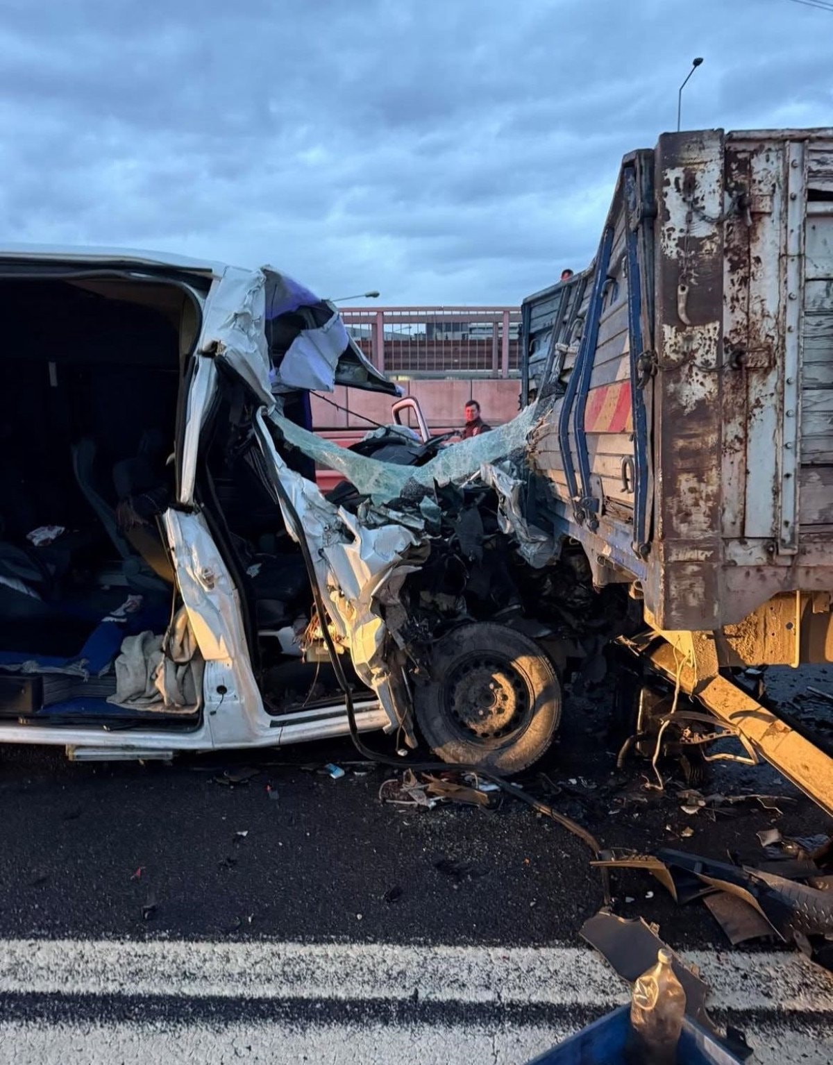 Kocaeli Gebze ilçesi TEM Otoyolu ile Kuzey Marmara Otoyolu bağlantı yolunda S.K.’nin kullandığı servis minibüsü, aynı yönde giden A.C. idaresindeki demir sac yüklü kamyona arkadan çarptı.