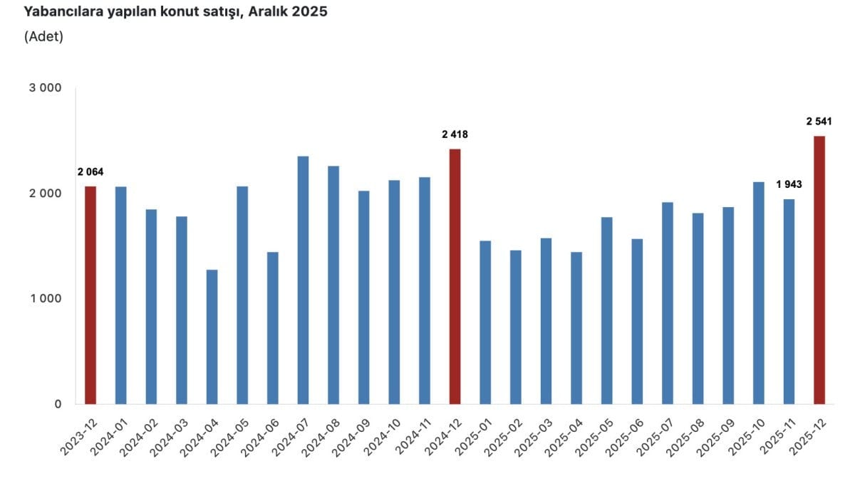 Yabancılara yapılan konut satışları aralık ayında, bir önceki yılın aynı ayına göre yüzde 5,1 oranında artarak 2 bin 541 oldu. Aralık ayında toplam konut satışları içinde yabancılara yapılan konut satışının payı yüzde 1 olarak gerçekleşti.