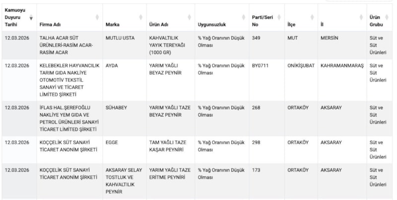 Bazı süt ürünleri ve peynirlerde yağ oranı beyan edilenin altında olduğu, tağşiş olarak değerlendirildiği haberler yer aldı.